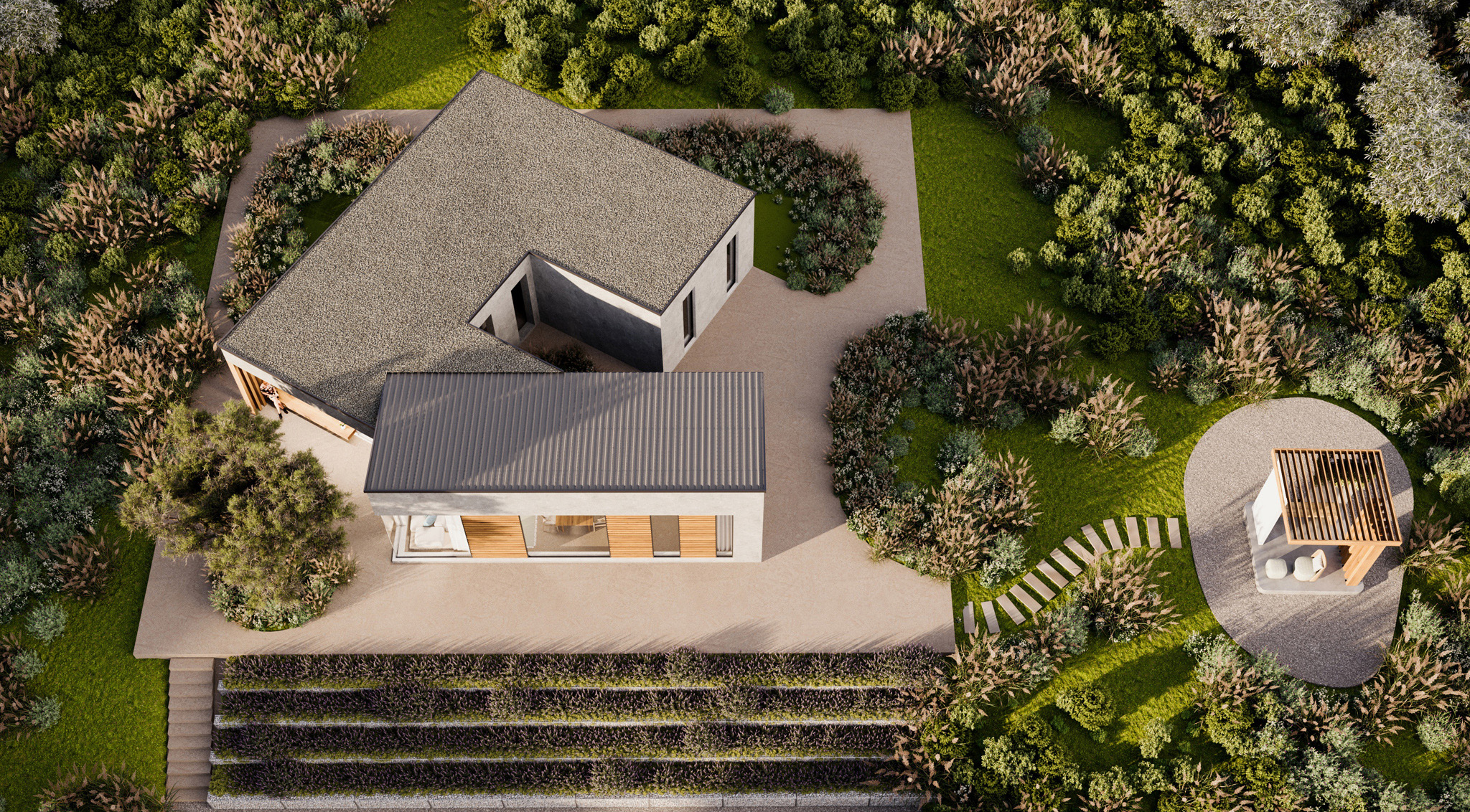 Pietra, legno, acqua e luce si intervallano all’insegna di un’architettura sostenibile, contemporanea e a basso consumo energetico.