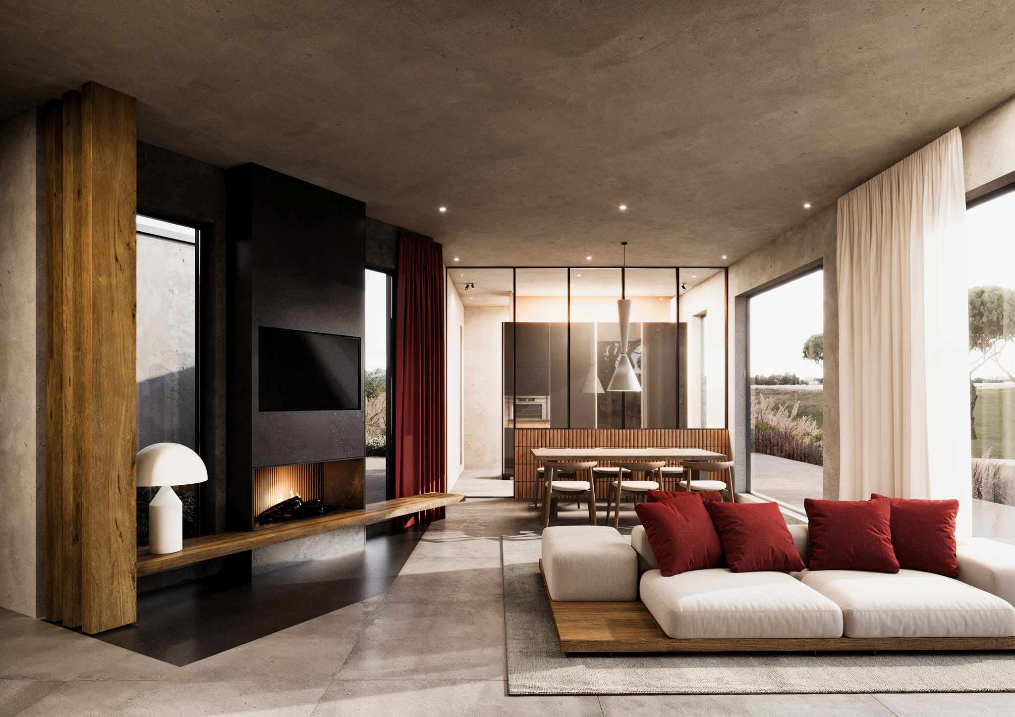 La zona living open space con cucina a vista così come tutte le camere da letto, padronale e ospiti sono dotate di ampie vetrate che permettono agli interni di fondersi con il giardino circostante. La terrazza verso il lato sud protegge la facciata contro le perdite di energia.