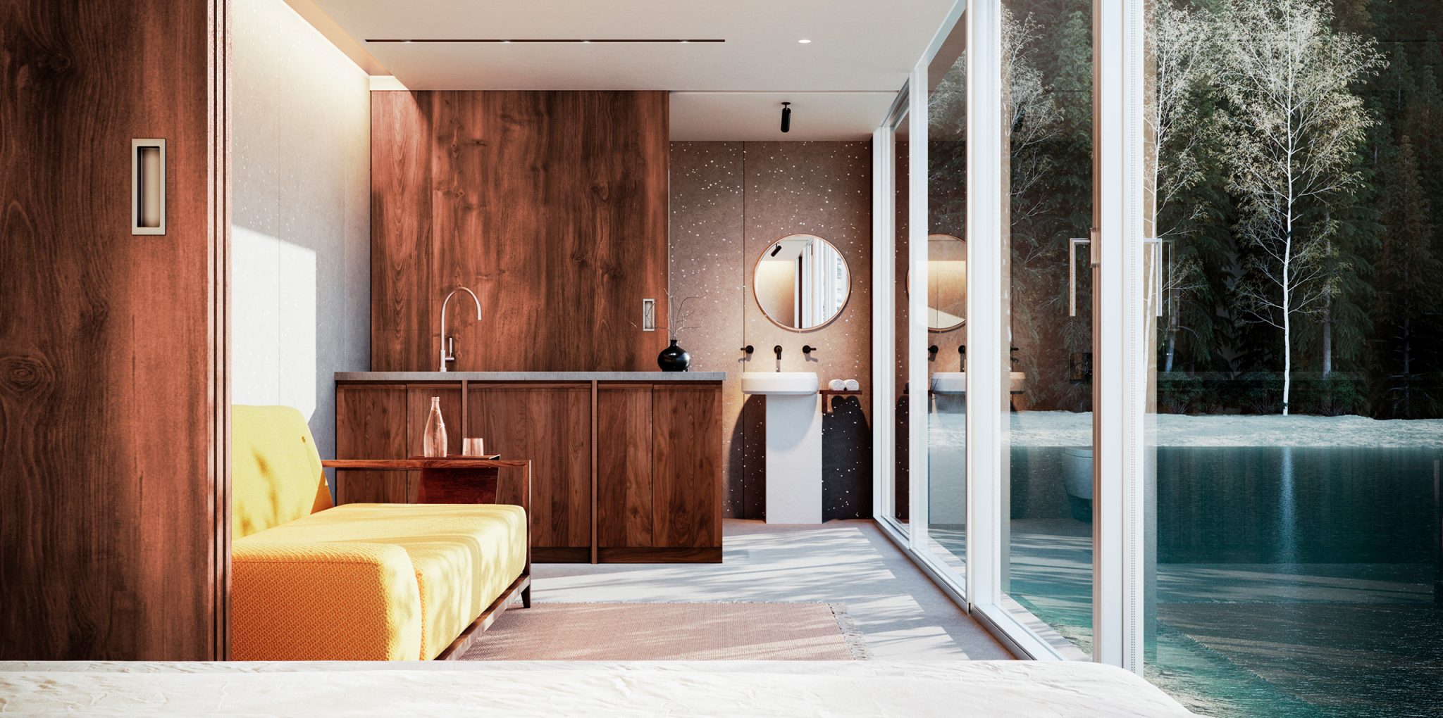 Il modulo prefabbricato è progettato per soddisfare le più strette esigenze di sostenibilità, e consiste in una cellula minimale di dimensioni ridotte (3 x 9 metri) per permetterne un facile trasporto e montaggio, definita da una cornice strutturale in acciaio corten e da una grande facciata panoramica in alluminio in cui elementi fissi ed apribili si integrano senza alcuna interruzione di continuità, un dispositivo “tutto vetro” per immergersi nel paesaggio circostante.